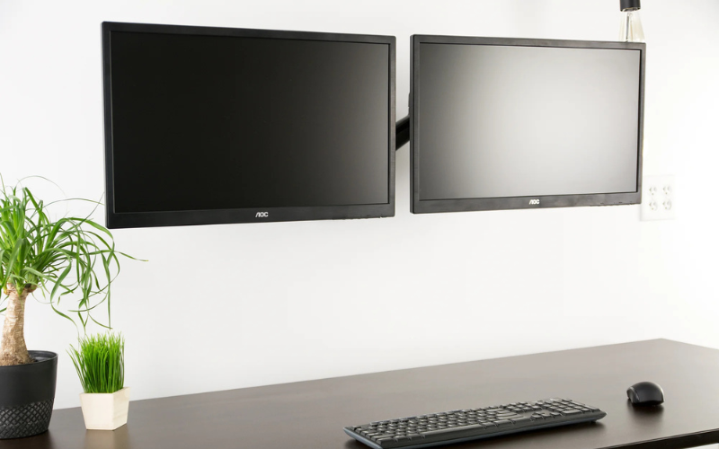 However, mounting the same two monitors on a single, dual monitor arm frees up much desk space, which you can use for material placement and other tasks. Similarly, using a wall-mounted design can completely free up your desk space.